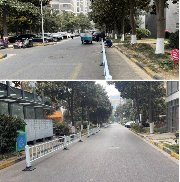 施工期间,物业严格遵循安全规范,并避开早晚高峰时段作业,最大限度减少对业主生活的影响。立柱安装后,主干道焕然一新:原本被私家车挤占的消防通道恢复畅通,非机动车与行人通行空间显著拓宽,早晚高峰拥堵现象大幅缓解。