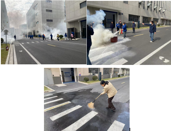 集结完毕后,演练进入实操环节。安全员结合园区厂房密集、设备集中的特色,重点讲解了电气火灾、设备火灾的处置要点,着重强调“提、拔、握、压”四字操作要领。随后,员工们依次上前实操演练,手握灭火器对准模拟火源根部精准喷射,成功将“火情”扑灭,直观掌握了初期火灾的处置技巧。演练尾声,物业保洁人员迅速进场,对演练现场进行全面清理,快速恢复场地整洁。
